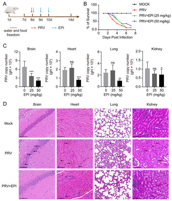 The above cell-based experiments confirmed that EPI effectively inhibits PRV replication. To further evaluate EPI’s inhibitory effects on PRV replication in vivo, a mouse challenge experiment was conducted, as outlined in Figure 8A. As shown in Figure 8B, mice began to exhibit significant neurological symptoms and mortality by 3 days post-infection (3 dpi), with survival rates dropping to 12.5% by 7 dpi compared to untreated mice. In the group treated with 25 mg/kg of EPI, although neurological symptoms and some mortality were observed by 3 dpi, fewer mice died compared to the PRV-challenged group. Treatment with 50 mg/kg EPI significantly improved survival rates, with a 12.5% increase in survival compared to the PRV-challenged group.