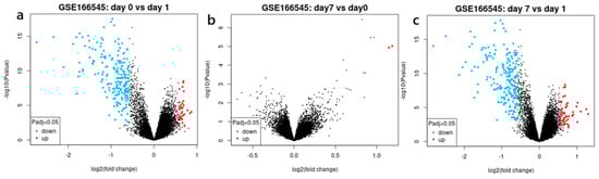 Volcano plots depicting the distribution of all differentially expressed genes (DEGs) in (a) GSE166545: Day 0 versus Day 1, (b) GSE166545: Day 7 versus Day 0, and (c) GSE166545: Day 7 versus Day 1. Red, blue, and black colors represent up-regulated genes, down-regulated genes, and genes with no significant difference in expression, respectively.