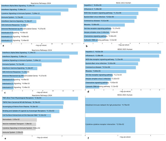 Significant Reactome pathways at Days 0–1, Days 1–7, and Days 0–7 (a,c,e), respectively. KEGG pathways at Days 0–1, Days 01–7, and Days 0–7 (b,d,f), respectively, enriched with DEGs. *—p value for each pathway.