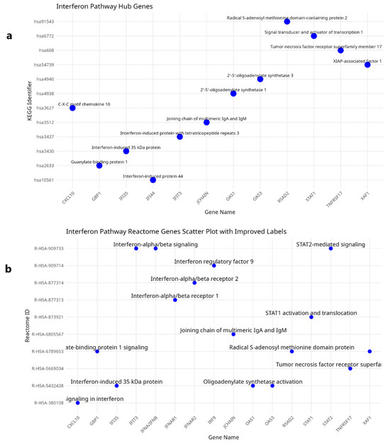 The scatter plots presented in Figure 3a,b illustrate the hub genes associated with the interferon alpha and beta signaling pathway within the KEGG and Reactome datasets, respectively. These visual representations facilitate a comparative examination of the expression patterns and functional roles of the hub genes across both datasets. In the KEGG dataset, prominent hub genes such as STAT1, RSAD2, IFI35, and CXCL10 exhibit robust associations with the interferon alpha/beta signaling pathway. The distribution observed in this scatter plot suggests an elevated enrichment of genes implicated in direct immune responses, with a particular emphasis on antiviral mechanisms. Analogously, the Reactome dataset reveals significant mapping of hub genes, including STAT1, IFIT3, OAS1, and GBP1, within the interferon signaling pathway. Moreover, the data from Reactome appear to accentuate downstream signaling events, notably the transcriptional activation of interferon-stimulated genes (ISGs).