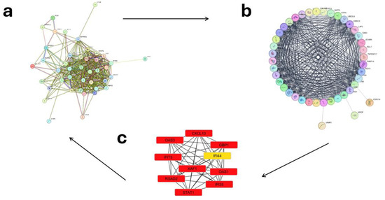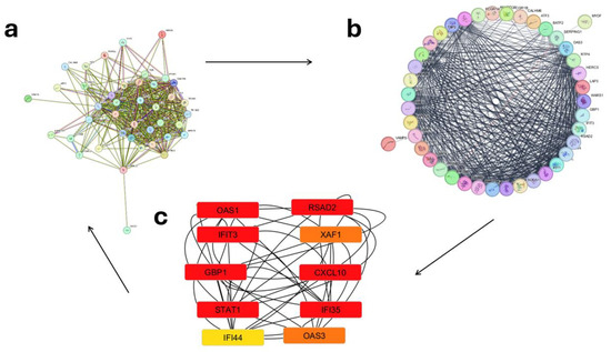 (a) Analysis of protein/protein interactions and identification of hub genes for post-vaccination periods (Days 1–7). The STRING database was used to predict interactions among the 60 up-regulated and 13,092 down-regulated differentially expressed genes (DEGs) common to both microarray datasets. (b) Data analysis was conducted using the Network Analyzer plugin for Cytoscape. (c) Subsequently, the Cytohubba plugin was employed to analyze hub genes and determine the top-ranking genes (top 10 presented). Red = High up-regulation of gene expression, Orange = Moderate up-regulation, and Yellow = Low up-regulation or mild expression change.