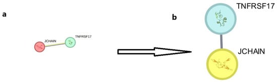 (a) Analysis of protein/protein interactions and identification of hub genes for post-vaccination periods (Days 0–7). The STRING database was used to predict interactions among the 2 up-regulated and 13,158 down-regulated differentially expressed genes (DEGs) common to both microarray datasets. (b) Represents both the Network Analyzer plugin for Cytoscap and the Cytohubba plugin to analyze hub genes and determine the top-ranking genes (top 2 presented).