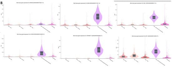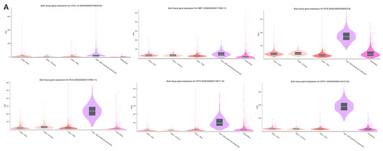 We extracted protein-level expression data for the hub genes from the HPA database (https://www.proteinatlas.org/ (accessed on 14 January 2025)). Our investigation centered on blood-related tissues, encompassing whole blood, lymphocytes, and additional immune cells. For each gene, we input its designation into the search interface, chose Homo sapiens, subsequently selected blood tissue, and exported the resulting data in graphical format. On the other hand, we acquired transcript-level expression data from the GTEx Portal (https://gtexportal.org/ (accessed on 14 January 2025)). The RNA expression levels of the hub genes were examined across whole blood and immune-associated tissues. We performed comparative analyses of transcriptomic profiles in GTEx to verify the presence and activity of these hub genes in blood and immune cells.