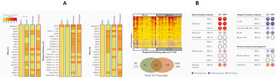 (A,B) Transcriptional profiles and modular expression analysis following influenza vaccination. (A) Heatmap showing differentially expressed genes (adjusted p < 0.05) across study participants, highlighting immune-related gene expression patterns. (B) Modular expression analysis at Day 1 post-vaccination comparing previously vaccinated (PV) and non-previously vaccinated (NPV) individuals. Overexpression (red), underexpression (blue), and unchanged expression (white) are indicated. Data cited from GSE166545.