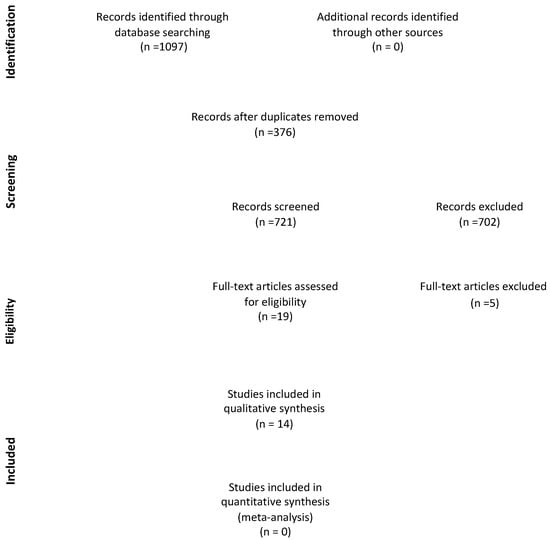 In total, the initial search strategies generated 1097 articles. After duplicate removal, 721 articles remained for title and abstract evaluation. A total of 702 papers were excluded due to mismatch with our search criteria, different evaluated outcomes, and topic. Then, 19 articles were retained for final full text review. Finally, 14 articles [20,21,22,23,24,25,26,27,28,29,30,31,32,33] which have so far evaluated the potentially of cannabinoid on orofacial pain, oral inflammation, and bone healing. Reports were excluded if they were narrative reviews, systematic reviews, correspondence, and letters to the editor, as shown in Table 2 [34,35,36,37,38,39]. The results of the selected studies were classified under the following subheadings: effect of cannabinoid on orofacial pain, oral inflammation, and bone healing (in vitro or in vivo). Some studies touched upon different characteristics; therefore, they were included in two/three categories called “synergistic effects of cannabinoids”. The Preferred Reporting Items for Systematic Reviews and Meta-Analyses (PRISMA) Flow Diagram 2020 in Figure 2 depicts the flow of included studies through each phase of the review process.