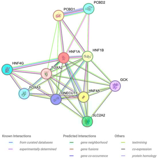 The assessment of HNF1A interactive proteins was conducted using the Search Tool for the Retrieval of Interacting Genes/Proteins (STRING) (https://string-db.org, accessed on 18 January 2025), which relies on co-expression, experimental data, function, and gene fusion and interaction.