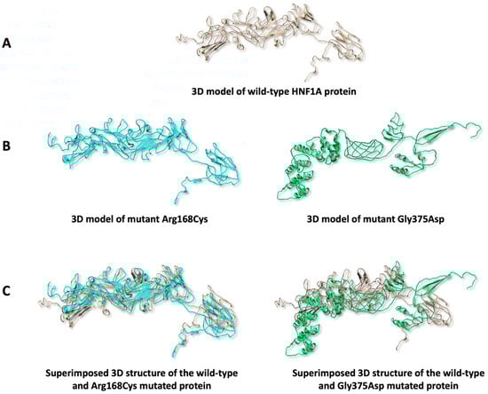 The three-structure (3D) analysis of the wild-type HNF1A protein and mutants. (A) The 3D model of the normal HNF1Aprotein. (B) The 3D model of the mutants (Arg168Cys and Gly375Asp). (C) Superimposed models of the mutants with the wild-type HNF1A protein.