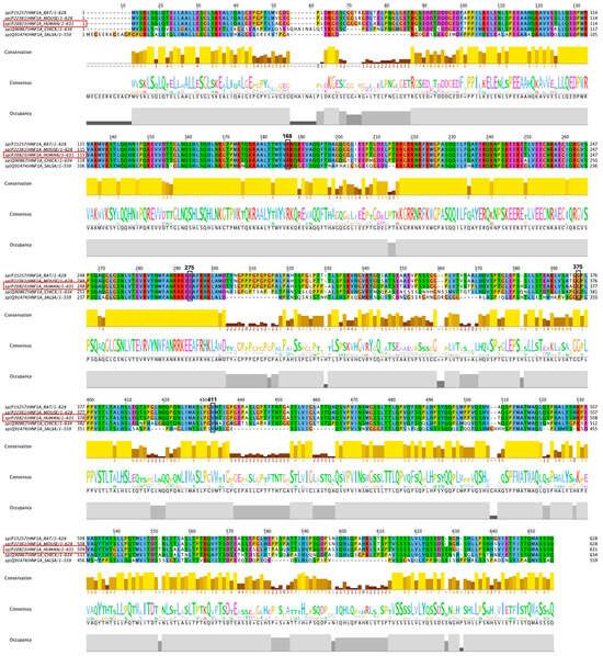 The conservation assessment of the HNF1A protein among the species was conducted using Jalview software. The amino acid sequence of the human HNF1A protein, along with those of other species, was retrieved from the NCBI’s HomoloGene sub-database (https://www.ncbi.nlm.nih.gov, accessed on 25 January 2025). Multiple sequence alignment (MSA) conservation analysis, and consensus were carried out on Jalview software to examine the conserved amino acids among selected species and visualised by using Jalview software (version 2.11.4.1).