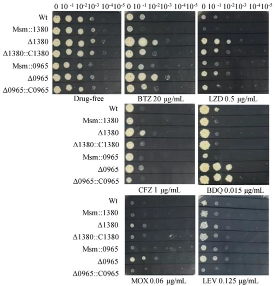 For the solid plate assay, cultures were adjusted to an OD600 of 0.9. Bacterial suspensions were serially diluted in 10-fold increments to obtain six different dilutions, ranging from the undiluted suspension to a 10−5 dilution. A 1 µL aliquot of each dilution was spotted onto solid media containing different concentrations of drugs, with 7H10 solid media without antibiotics serving as the control. The plates were incubated at 37 °C for three days, and colony growth was assessed visually and photographed.