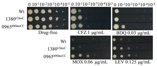 The sensitivity of single gene-edited strains to various antibiotics. Wt, wild-type Msm strain; 138012insC, Msm strain with a 12insC insertion mutation in MSMEG_1380; 0965400insCC, Msm strain with a 400insCC insertion mutation in MSMEG_0965. CFZ, clofazimine; BDQ, bedaquiline; MOX, moxifloxacin; LEV, levofloxacin. The experiment was repeated three times.