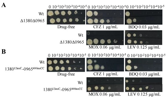 Dual mutations of MSMEG_1380 and MSMEG_0965 affect Msm sensitivity to various antibiotics. (A) The sensitivity of Wt and Δ1380Δ0965 to various antibiotics. (B) The sensitivity of Wt and 138012insC-0965400insCC to various antibiotics. Wt, wild-type Msm strain; Δ1380Δ0965, MSMEG_1380 and MSMEG_0965 double-knockout Msm strain; 138012insC-0965400insCC, Msm strain with a 12insC insertion in MSMEG_1380 and a 400insCC insertion in MSMEG_0965. CFZ, clofazimine; BDQ, bedaquiline; MOX, moxifloxacin; LEV, levofloxacin. The experiment was repeated three times.