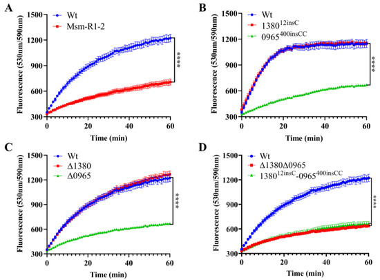 To assess the impact of MSMEG_0965 on cell wall integrity [32,33], we performed the EtBr accumulation assay in Msm-R1-2, knockout and gene-edited Msm strains [34]. The results showed that Msm-R1-2, Δ0965 and 0965400insCC strains exhibited significantly reduced cell wall permeability, while the permeability of Δ1380 and 138012insC remained unchanged. Similarly, the permeability of Δ1380Δ0965 and 138012insC-0965400insCC was also significantly decreased (Figure 5). These results indicate that knockout and mutation of MSMEG_0965 reduce cell wall permeability, thereby contributing to drug resistance, while MSMEG_1380 does not appear to affect cell wall permeability.