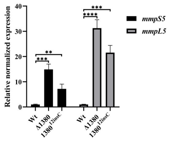 Given the observed resistance phenotype in MSMEG_1380 mutants, we examined the expression levels of mmpS5 and mmpL5 in the mutant strains [22]. The results demonstrated that compared to the wild-type Msm, mmpS5 expression increased 14.89-fold in Δ1380 and 7.16-fold in 138012insC, while mmpL5 expression increased 31.24-fold and 21.53-fold, respectively (Figure 6). These findings confirm that mutations in MSMEG_1380 significantly enhance the mmpS5-mmpL5 operon expression, thereby increasing drug efflux capacity.