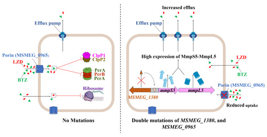 Building on these findings, the synergistic resistance observed in the double mutant likely results from the combined disruption of uptake and efflux processes, as illustrated in Figure 7 [42,43,44]. To assess the broader relevance of this mechanism, we examined homologs in pathogenic mycobacteria. For example, the Rv0678 gene (the MSMEG_1380 homolog in Mtb) promotes efflux-mediated resistance to BDQ and CFZ [45,46]. Similarly, mutations in MAB_4384 (the homolog of MSMEG_1380 in Mycobacterium abscessus) are linked to LZD resistance [47]. Although Mtb lacks a homolog of MSMEG_0965 (MspA) [48], expressing MspA in Mtb enhances drug susceptibility [37], suggesting the presence of compensatory uptake mechanisms, such as the aquaporin Rv1698 [49]. Thus, despite molecular divergence, coordinated efflux–uptake regulation appears to be a conserved resistance strategy across mycobacteria.