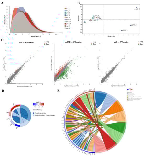 Transcriptomic analysis of biofilms. (A) Expression distribution density after removal of abnormal samples. (B) PCA after removal of abnormal samples. (C) Scatter plot of differential expressed genes among three comparison groups (PAO1-ΔpelF vs. PAO1-WT, PAO1-ΔpslAB vs. PAO1-WT, and PAO1-Δalg8 vs. PAO1-WT). (D) KEGG enrichment pathway of differential genes in PAO1-ΔpelF vs. PAO1-WT. (E) KEGG enrichment pathway of differential genes in PAO1-ΔpslAB vs. PAO1-WT.