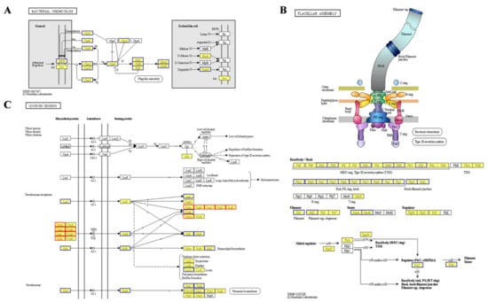 The two-component regulatory system FleS/FelR plays a pivotal role in governing the expression of a suite of genes central to flagellar synthesis, adhesion, aggregation, motility, and antibiotic resistance [,,]. In strain PAO1-ΔpelF, compared to PAO1-WT, the upregulation of fleS and felR genes enhances flagellar synthesis efficiency in biofilms, thereby improving cell motility. Flagella is indispensable to the structural integrity of P. aeruginosa biofilm within genes such as fliM, fliE, and flhA, serving as key components in flagellar assembly []. Increased expression of these genes in strain PAO1-ΔpelF boosts cell motility, bacterial dispersion, and subsequent biofilm formation. Bacterial chemotaxis, the bacteria’s navigational response to chemical gradients in their surroundings, is fundamental to their quest for nutrients. This innate ability directs bacteria toward regions abundant in food molecules or away from noxious zones []. In contrast, strain PAO1-ΔpslAB shows a significant downregulation of genes associated with these functions. Specifically, 37 genes in the bacterial chemotaxis pathway were downregulated (Figure 3A), implicating their role in flagellar assembly []. Additionally, 24 genes within the flagellar assembly pathway were noted to be downregulated (Figure 3B), leading to reduced flagellar synthesis, diminished bacterial motility, and impaired biofilm formation.