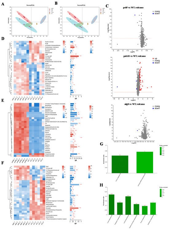 Metabolomic analysis of biofilms. (A) PCA scores of all samples in positive ion mode. (B) PCA scores of all samples in negative ion mode. (C) Volcano plot of significantly differential metabolites in the three comparison groups (PAO1-Δpelf Vs. PAO1-WT, PAO1-Δpslab Vs. PAO1-WT, and PAO1-Δalg8 Vs. PAO1-WT). (D) Cluster heatmap and VIP of metabolites in PAO1-Δpelf Vs. PAO1-WT. On the left is the clustering dendrogram of metabolites—branches that are closer indicate more similar expression patterns of all metabolites within the samples; On the right is the VIP bar plot, where the bar length (*, **, ***) represents the contribution value of each metabolite to group differences. A longer bar (or more asterisks) signifies a larger difference in that metabolite between the two groups. (E) Cluster heatmap and VIP of metabolites in PAO1-Δpslab Vs. PAO1-WT. (F) Cluster heatmap and VIP of metabolites in PAO1-Δalg8 Vs. PAO1-WT. (G) KEGG enrichment pathway of differential metabolites in PAO1-Δpelf Vs. PAO1-WT. (H) KEGG enrichment pathway of differential metabolites in PAO1-Δpslab Vs. PAO1-WT.