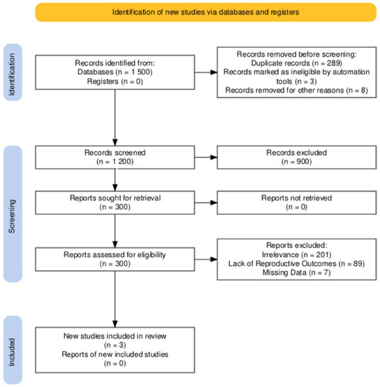 A comprehensive search was conducted across PubMed, EMBASE, and the Cochrane Library for studies published up to 31 December 2024. The following keywords and Boolean operators were used: “tamoxifen” AND (“breast cancer” OR “breast carcinoma”) AND (“fertility preservation” OR “pregnancy outcomes” OR “treatment interruption”). The reference lists of selected studies and related reviews were also screened to identify additional eligible articles. The database search identified 1500 studies. After removing 298 duplicates, 1200 unique records were screened based on titles and abstracts. Of these, 900 records were excluded for not meeting the eligibility criteria, leaving 300 full-text articles for assessment. Following a detailed review, 297 articles were excluded for irrelevance, lack of reproductive outcomes, or missing data. Three studies were ultimately included in this review. The PRISMA flow chart summarizing the selection process is presented in Figure 1.