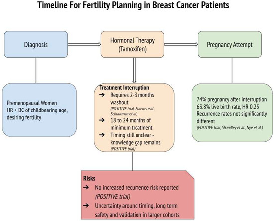 Timeline for fertility planning in premenopausal women with hormone receptor-positive (HR+) breast cancer undergoing tamoxifen therapy. The diagram outlines key steps and considerations for treatment interruption in patients desiring pregnancy, reporting the main findings from the studies [13,16,17,20,21].