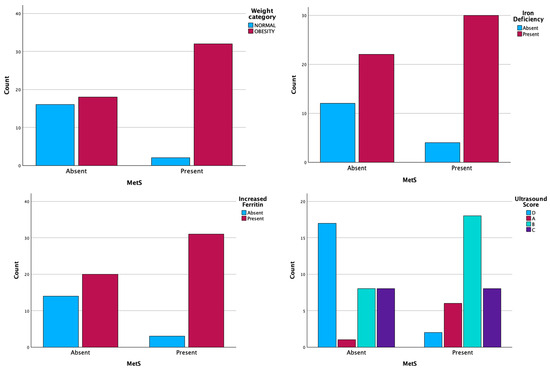 The present of MetS was statistically correlated with obesity, serum iron deficiency, increased serum ferritin levels, and ultrasonographic changes in the liver. The median age at diagnosis of MetS was 11 years and the BMI was 27.9 kg/m2 (Table 4, Figure 1).