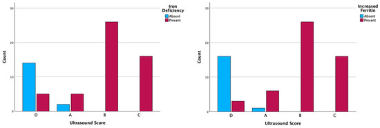 Of all patients included in this study, 16 (23.5%) cases had normal serum iron level, 2 (2.9%) cases were found with ultrasonographic Score A, and 14 (20.5%) with Score D. Deficiency serum iron was predominantly observed in patients with ultrasonographical changes, an aspect that is statistically correlated (Table 5, Figure 2).