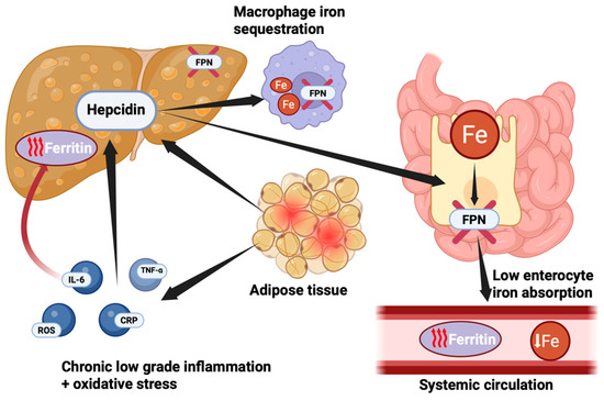 Pathophysiological mechanism linking adipose tissue, chronic low-grade inflammation, and disorders in iron metabolism observed in children with obesity and MetS. Excess adipose tissue contributes to a pro-inflammatory state, characterized by elevated production of cytokines such as IL-6 and tumor necrosis factor-alpha (TNF-α), along with increased oxidative stress markers (reactive oxygen species—ROS) and C-reactive protein (CRP). These inflammatory mediators stimulate hepatic synthesis of hepcidin, a key regulator of systemic iron. It binds to ferroportin (FPN)—a cellular iron exporter expressed by enterocytes and hepatic macrophages—thereby reducing intestinal iron absorption and promoting iron sequestration in macrophages. As a consequence, we encounter low serum iron. In response to this functional iron deficiency and persistent inflammatory state, ferritin synthesis is upregulated as part of the acute-phase response. This explains the paradoxical finding of elevated serum ferritin despite low circulating iron levels in children with obesity and MetS. Created with https://www.biorender.com (accessed on 12 April 2025).