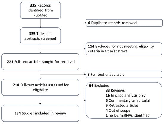 Preferred Reporting Items for Systematic Reviews and Meta-Analyses (PRISMA) flow diagram. Flow of information through the various phases of the systematic review. A comprehensive search on PubMed, following the PRISMA guidelines, queried 335 studies. No duplicate records were found. As they were not in English (n = 4) or not about miRNAs in CCM, AVM, MMD, or ICH (n = 110), 114 articles were excluded. In addition, 3 full texts were not retrievable. From the 218 full-text articles assessed for eligibility, 64 were excluded because they were either reviews (n = 33), in silico analyses (n = 16), commentary or editorial (n = 5), retracted articles (n = 5), or out of scope (n = 4). One article did not find any differentially expressed (DE) miRNAs in a mouse ICH model. Finally, 154 studies were included in this systematic review.