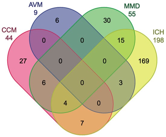 Unique and shared miRNAs across CCM, AVM, MMD, and ICH studies. Venn diagram illustrating the common and distinct miRNAs identified in the four studied pathologies.