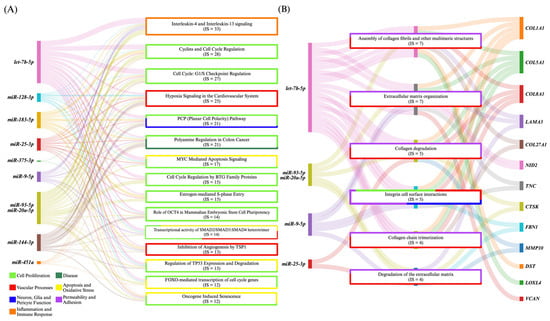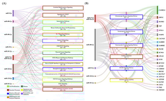 Ingenuity Pathway Analysis (IPA) of differentially expressed (DE) miRNAs common between cerebral cavernous malformation (CCM) and intracerebral hemorrhage. The IPA analyses of the gene targets and their associated pathways of let-7b-5p, miR-128-3p, miR-183-5p, miR-25-3p, miR-375-3p, miR-9-5p, miR-93-5p, miR-20a-5p, miR-144-3p, miR-451a, and miR-27a, commonly differently expressed between cerebral cavernous malformation (CCM) and intracerebral hemorrhage, (A) identified 450 pathways (p < 0.05, false discovery rate [FDR] corrected) related to cell proliferation and vascular processes. Only pathways showing an interaction score (IS) of 12 and a gene ratio of 0.29 are displayed. (B) Further analyses identified 190 enriched pathways (p < 0.01, FDR corrected) with gene targets (i.e., of the miRNAs mentioned above) that have been shown to be dysregulated in the transcriptome of neurovascular units of surgically resected CCMs. This result suggests common pathogenic processes between the CCM disease and intracerebral hemorrhage. Only pathways with an IS of 4 and a gene ratio of 0.29 are displayed. IPA considered miR-93-5p and miR-20a-5p as the same entities due to the same seed sequence, while miR-27a was unmapped.