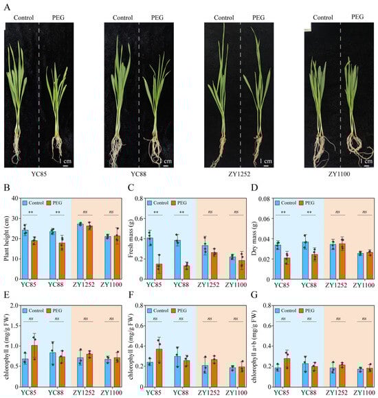 Effects of drought stress simulated by polyethylene glycol (PEG) on different cultivars of hulless barley plants. Drought-sensitive (YC85 and YC88) and drought-tolerant hulless barley (ZY1252 and ZY1100) varieties were selected for the experiment. (A) Phenotypes of hulless barley plants treated with or without PEG. Thirteen-day-old plants grown under Yoshida (Control) were treated with Yoshida or 16% PEG for another seven days. Bar = 1 cm. (B–D) Effect of PEG on shoot length (B), shoot fresh mass (C), and shoot dry mass (D) of hulless barley plants. Thirteen-day-old plants grown under Yoshida (Control) were treated with Yoshida or 16% PEG (Drought) for another seven days. The values indicate the means ± SDs (n = 4). ** p < 0.01 and ns p > 0.05, Student’s t test. (E–G), Effect of PEG on chlorophyll a (E), chlorophyll b (F), and chlorophyll a + b (G) of hulless barley plants. Thirteen-day-old plants grown under Yoshida (Control) were treated with Yoshida or 16% PEG for another three days. The values indicate the means ± SDs (n = 3). ** p < 0.01 and ns p > 0.05, Student’s t test.