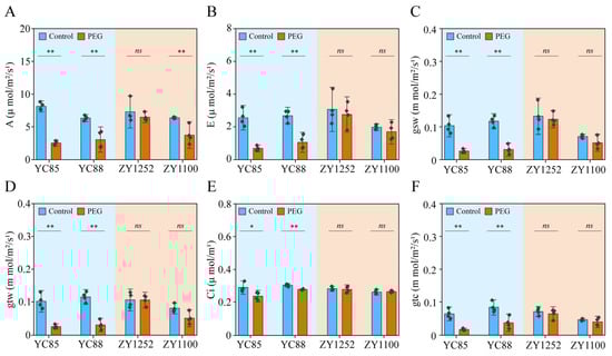 Photosynthetic physiological parameters of hulless barley plants under control conditions and PEG treatment. The photosynthetic gas exchange of YC85, YC88, ZY1252, and ZY1100 was measured with LI-6800 (LICOR, Inc., Lincoln, NE, USA) under control conditions and PEG treatment. Thirteen-day-old plants grown under Yoshida (Control) were treated with Yoshida or 16% PEG for another two days. Drought-sensitive (YC85 and YC88) and drought-tolerant hulless barley (ZY1252 and ZY1100) varieties were selected for the experiment. (A) Net photosynthetic rate (A); (B) transpiration rate (E). (C) Stomatal conductance of water vapor (gsw); (D) total conductivity to water vapor (gtw); (E) intercellular CO2 concentration (Ci), and (F) stomatal conductance of CO2 (gtc). The values indicate the means ± SDs (n = 4). ** p < 0.01, * p < 0.05 and ns p > 0.05, Student’s t test.