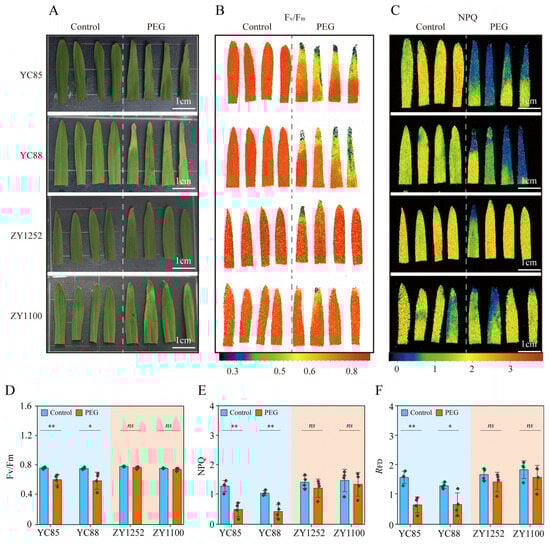 Chlorophyll fluorescence parameters of hulless barley plants under control conditions and PEG treatment. The photosynthetic gas exchange of the plants was measured with FluorCam (PSI, Brno, Czech Republic) under control conditions and PEG treatment. Thirteen-day-old plants grown under Yoshida (Control) were treated with Yoshida or 16% PEG for another two days. Drought-sensitive (YC85 and YC88) and drought-tolerant hulless barley (ZY1252 and ZY1100) varieties were selected for the experiment. The experimental materials were obtained from two different media (control and 16% PEG treatment), and the first fully unfolded leaf was taken from each medium after 15 min of dark adaptation for the measurement of their chlorophyll fluorescence parameters. (A) Phenotypes of hulless barley plants treated with or without PEG. Bar = 1 cm; (B) imaging of maximum quantum yield of PSII (Fv/Fm); (C) imaging of non-photochemical quenching (NPQ); (D) Fv/Fm; (E) NPQ; and (F) fluorescence decrease ratio (RFD). The values indicate the means ± SDs (n = 4). ** p < 0.01, * p < 0.05 and ns p > 0.05, Student’s t test.