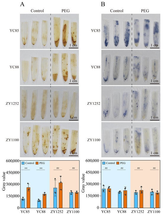 ROS accumulation in hulless barley plants under control conditions and PEG treatment. Thirteen-day-old plants grown under Yoshida (Control) were treated with Yoshida or 16% PEG for another three days. Drought-sensitive (YC85 and YC88) and drought-tolerant hulless barley (ZY1252 and ZY1100) varieties were selected for the experiment. (A) DAB staining was used to determine the hydrogen peroxide content under control conditions and PEG treatment, upper. The relative amount of DAB was estimated using ImageJV1.53, with measurements taken from the above plants, lower. (B) NBT staining was used to assess the superoxide anion in the control and under PEG treatment, upper. The relative amount of NBT was estimated using ImageJV1.53, with measurements taken from the above plants, lower. The values indicate the means ± SDs (n = 3). ** p < 0.01 and ns p > 0.05, Student’s t test.