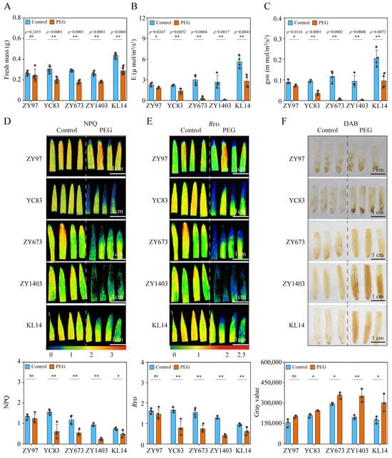 Verification of drought resistance evaluation. Thirteen-day-old seedlings of ZY97, YC83, ZY673, ZY1403, and KL14 were treated with 16% PEG in the drought group and were treated with Yoshida in the control group. The experimental materials were obtained from two different media, and the first leaf was taken from each medium for the measurement of different parameters. (A–C) Effect of PEG-simulated drought treatment on fresh mass (A), transpiration rate, ‘E’ (B), and stomatal conductance of water vapor, ‘gsw’ (C). The values indicate the means ± SDs (n = 8 for fresh mass; n = 4 for ‘E’ and ‘gsw’). ** p < 0.01 and * p < 0.05, Student’s t test. (D) The photosynthetic gas exchange of the plants was measured with FluorCam (PSI, Brno, Czech Republic) in the control and under PEG treatment. Imaging of non-photochemical quenching (NPQ), upper. The level of NPQ, lower. The values indicate the means ± SDs. ** p < 0.01, * p < 0.05 and ns p > 0.05, Student’s t test. (E) Imaging of the fluorescence decrease ratio (RFD), upper. The level of RFD, lower. The values indicate the means ± SDs (n = 4). ** p < 0.01 and ns p > 0.05, Student’s t test. (F) DAB staining was used to determine the hydrogen peroxide content in the control and under PEG treatment, upper. The relative amount of DAB was estimated using ImageJ (V1.53), with measurements taken from the above plants, lower. The values indicate the means ± SDs (n = 3). ** p < 0.01, * p < 0.05 and ns p > 0.05, Student’s t test.