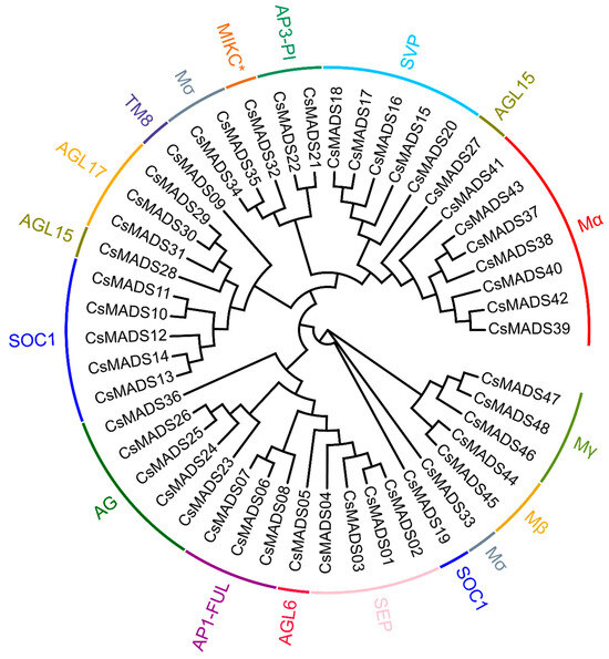 In previous studies, we identified 43 MADS-box genes in the cucumber V1 genome [33]. With the update of the cucumber family genome database, the cucumber genome version has been updated to V3. Therefore, we re-identified and revised the MADS-box gene family members in cucumber. In the cucumber V3 version, we identified a total of 48 MADS-box genes, and found that Csa014213 and Csa025232 aligned to the gene CsaV3_6G006010 in the cucumber V3 version database; similarly, Csa014249 and Csa026408 aligned to CsaV3_1G009750; while Csa014140 and Csa025231 aligned to CsaV3_6G006020. Csa014213 and Csa025232 have the same CDS sequence. Csa014140 and Csa025231 also have the same CDS sequence. The CDS sequence similarity between Csa014140 and Csa025231 is as high as 96%. These results indicate that there are some errors in the MADS-box genes identified in the V1 version. Therefore, there are actually 40 MADS-box genes in the V1 version, 48 in the cucumber V3 version, and the 48 MADS-box genes are divided into 14 subfamilies (Figure 1). The eight newly added genes are CsaV3_6G052910, CsaV3_6G051220, CsaV3_5G040310, CsaV3_5G040370, CsaV3_6G051590, CsaV3_3G009400, CsaV3_3G016620 and CsaV3_UNG063480 (Table 1).