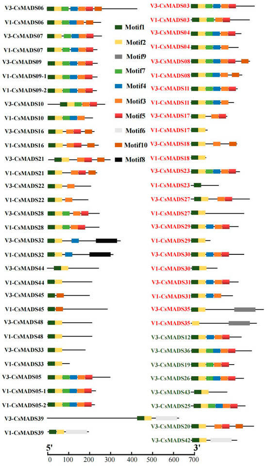 In order to explore whether differences in amino acid sequence lead to the changes in protein conserved motifs, we compared and analyzed the protein conserved motifs of MADS-box family members in the V1 and V3 versions. The results show that the amino acid length of 15 family members changed, but their protein motifs did not change. They were CsMADS05, CsMADS06, CsMADS07, CsMADS09, CsMADS10, CsMADS16, CsMADS21, CsMADS22, CsMADS28, CsMADS32, CsMADS33, CsMADS39, CsMADS44, CsMADS45 and CsMADS48, respectively. The protein motifs of 12 family members changed, including CsMADS03, CsMADS04, CsMADS08, CsMADS11, CsMADS17, CsMADS18, CsMADS23, CsMADS27, CsMADS29, CsMADS30, CsMADS31 and, CsMADS35. Similarly, we analyzed the conserved motifs of the eight newly identified proteins, and found that CsMADS42 contains only two motifs (motif1, motif2), and CsMADS43 contains three motifs (motif1, motif2, motif6) (Figure 2). In addition, the conserved motifs of the remaining six proteins numbered five to six. Moreover, we found that motif1 and motif2 are present in most proteins, indicating that motif1 and motif2 are highly conserved (Figure 2). The amino acid sequence for each motif is presented in Figure S1.