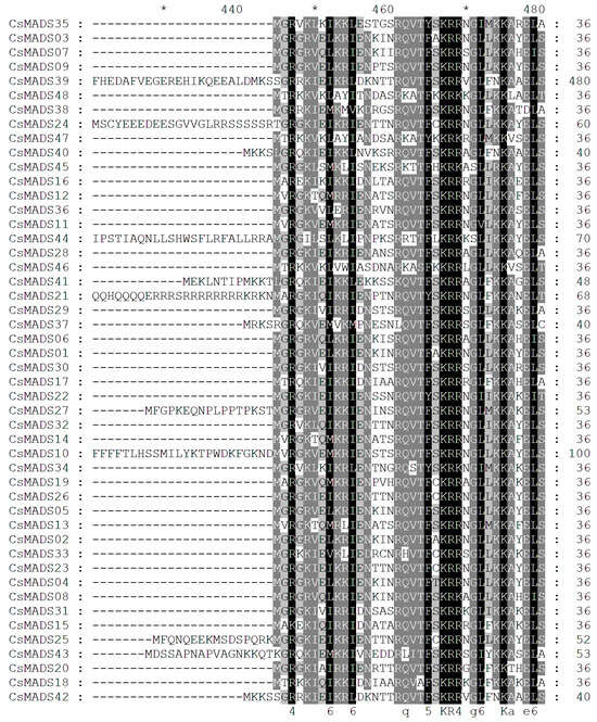 The multiple protein sequence alignment of the domains of MADS from cucumber.Conserved sequences are highlighted in black and grey shading; the black shading represents completely conserved sequences, while the grey shading represents incompletely conserved sequences. Black region: similarity over 80%. Grey region: similarity over 60–80%. “*” from left to right represents 430, 450, 470.