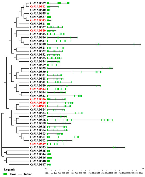 Phylogenetic tree and gene structure of MADS family members in C. sativus. The phylogenetic tree was constructed using the neighbor-joining (NJ) method with 1000 bootstrap replicates, based on the alignment of the identified MADS proteins in C. sativus. The gene structures of the 48 MADS genes identified in C. sativus were generated utilizing the Gene Structure Display Server v.2.0. In the structures, red represents the new genes in version of V3, the green box represents the exon, and the black line represents the intron.