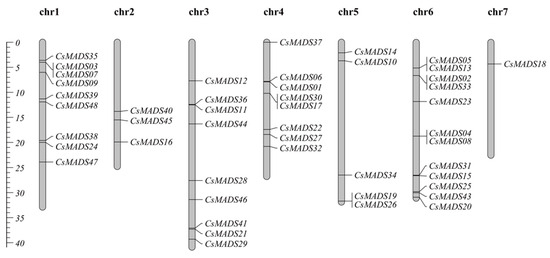 The chromosome distribution analysis of the cucumber CsMADS gene shows that the distribution of the CsMADS gene on seven chromosomes was uneven (Figure 5). Specifically, there are nine CsMADS genes on chromosome 1 and chromosome 3, three CsMADS genes on chromosome 2, eight CsMADS genes on chromosome 4, and five CsMADS genes on chromosome 5. The number of CsMADS genes on chromosome 6 is the largest, with 12 CsMADS genes, and the number of CsMADS genes on chromosome 7 is the smallest, with only one CsMADS gene (Figure 5).