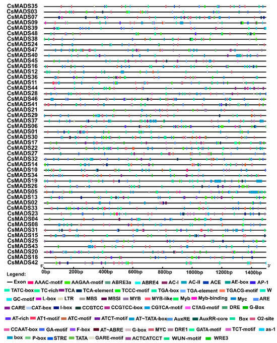 The analysis of the 1500 bp upstream sequence of the CsMADS gene revealed a variety of cis-acting elements (Figure 6). For example, there were hormone response elements (ABRE, CGTCA-motif, GARE-motif, TCA-element, TATC~box, TCA-element, TGACG motif, etc.), stress corresponding components (MBS, MBSI, etc.), and other important response elements in plant growth and development (ARE, CAT-box, LTR, GC-motif, O2-site, RE-element, TC~rich). This shows that the MADS-box family is widely involved in the growth and development of plants (Figure 6).