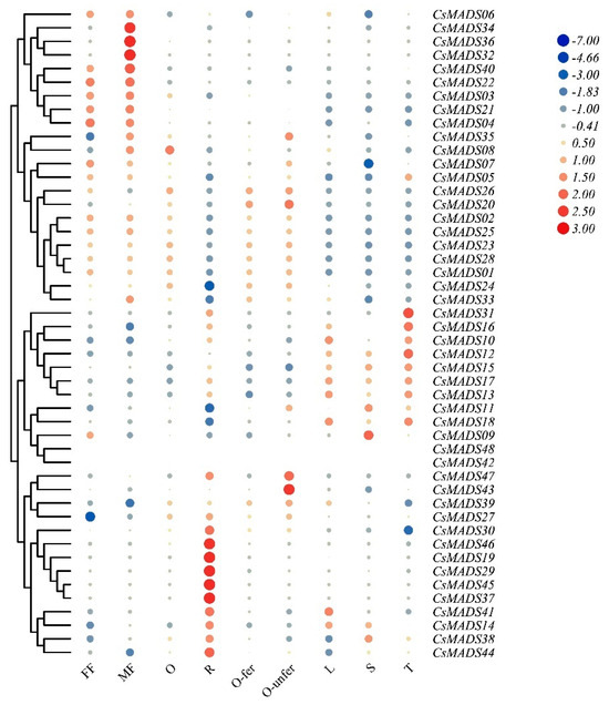 Temporal–spatial expression of cucumber MADS genes. Heatmap displaying the expression profiles of CsMADS genes in nine different cucumber tissues. The RNA-seq datasets with accession number PRJNA80169 were obtained from the Cucurbit Genomics Data website. The color scale represents Log2(FPKM) values, where blue and red indicate low and high expression levels, respectively. The FPKM values of CsMADS genes can be found in Table S1. R, root; S, stem; L, leaf; FF, female flower; MF, male flower; O, unexpanded ovary; O-fer, expanded fertilized ovary; O-unfer, expanded unfertilized ovary; T, tendril.