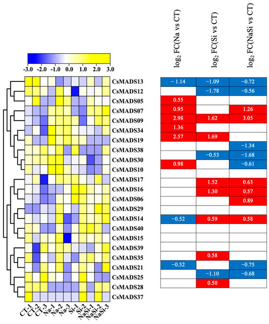 Firstly, the role of the CsMADS gene under salt stress was analyzed. The results are presented in the form of heat maps (Figure 8). Under NaCl treatment, most genes were up-regulated; only a small number of genes were down-regulated, including CsMADS13, CsMADS25 and CsMADS40. Silicon (Si) is considered to be an essential element for plant growth and development, and plays a significant role in promoting plant growth and development and enhancing stress resistance. We observed that gene expression undergoes significant changes exclusively under the Si treatment condition. The expressions of CsMADS06, CsMADS09, CsMADS16, CsMADS19, CsMADS21, CsMADS37 and CsMADS40 were up-regulated (Figure 8). In contrast, the expression of CsMADS12, CsMADS13, CsMADS28 and CsMADS30 were down-regulated. It is worth noting that the expressions of CsMADS06, CsMADS07, CsMADS09, CsMADS16, CsMADS29 and CsMADS40 were up-regulated under the treatment of NaCl and silicon(Si), suggesting that they play an important role in the process of plant resistance to salt stress (Figure 8).