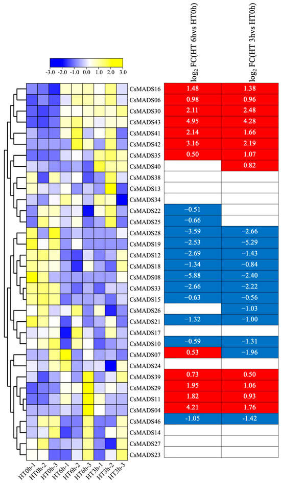 Expression profiles of CsMADS genes in response to heat stress treatments: A range of −3.00 to 3.00 was artificially set with the color scale limits according to the normalized values. The color scale shows increasing expression levels from blue to yeollow. Blue region: Down-regulated Red region: Up-regulated.The FPKM value of CsMADS genes under heat stress are listed in Table S3.