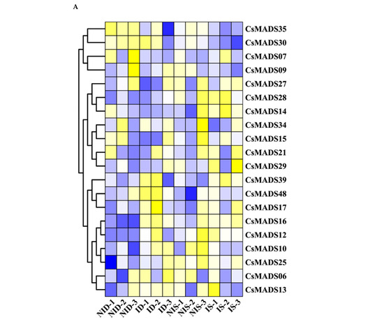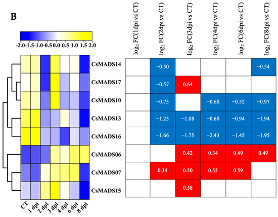 In the transcriptome data of cucumber seedlings inoculated with DM, only eight MADS genes were detected. CsMADS06 and CsMADS07 were up-regulated at most treatment time points, while CsMADS10, CsMADS13 and CsMADS16 were down-regulated at most treatment time points (Figure 10B).