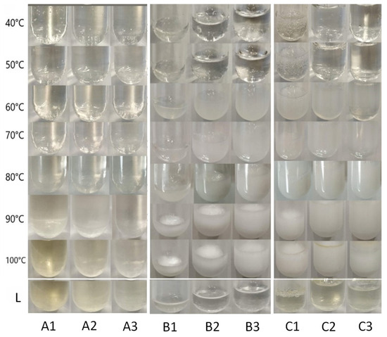Hydrogels after incubation at different temperatures for 1 h. From left to right: systems based on chitosan (A1, A2, A3), HPMC (B1, B2, B3) and hybrid chitosan/HPMC hydrogels (C1, C2, C3). A1–C3: refer to Table 1. L: the systems 3 d after the heating study.