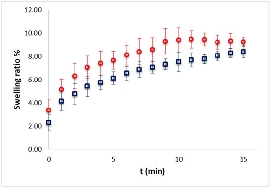 Percent swelling ratio of empty (red) and PC-loaded (blue) hydrogel (system C1 of Table 1), as a function of the incubation time.