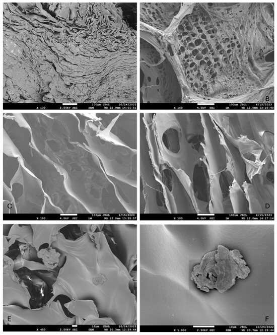 SEM images of the freeze-dried hydrogels. (A): empty hydrogel; (B): PC-loaded hydrogel; (C): CCM/BSA-loaded hydrogel; (D): CCM/BSA and PC-loaded hydrogel; (E): magnified area of the CCM/BSA-loaded hydrogel where aggregates are visible; (F): zoomed-in aggregate in CCM/BSA-loaded hydrogel.