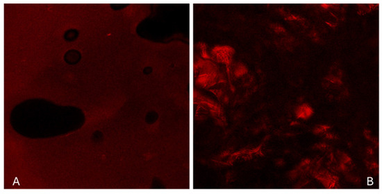 For the structural characterization of hydrogels, confocal scanning electron microscopy (CLSM) was applied. The results for the hydrogel C4 (system C4 of Table 1) are shown in Figure 4. As can be seen from the left image (Figure 4A) that depicts the surface of the hydrogel, its porous nature is verified. In the image of the cross-section (Figure 4B), the chaotic network resulting from the chemical interaction of the two polymers can be observed. The varying intensities of red fluorescence, indicating the presence of phycoerythrin, suggest that it has diffused unevenly. Specifically, phycoerythrin probably tends to concentrate in areas of the hydrogel dominated by one of the two polymers. Chitosan as a cationic polymer contains amino groups (-NH2) that can form strong hydrogen bonds and electrostatic interactions with the negatively charged regions of phycoerythrin. This enhances the stability and solubility of phycoerythrin within the hydrogel matrix. It is also known that chitosan remains soluble in acidic conditions but precipitates and forms a gel as the pH increases above approximately 6.5, a pH value beneficial for phycoerythrin stability [28].