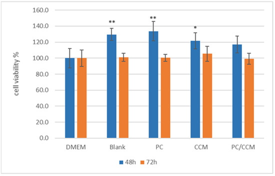 Thiazolyl blue tetrazolium bromide (MTT) cell proliferation assay with the WM164 cell line after 48 and 72 h in the presence of 10 µL crosslinked hydrogel spread at the bottom of the wells as a basis for cell growth: Dulbecco’s Modified Eagle’s Medium (DMEM); empty hydrogel, 10.4 mg (blank); hydrogel loaded with PC (PC), 10.4 mg/4 µg; hydrogel loaded with CCM/BSA (CCM), 10.4 mg/0.02 µg; hydrogel loaded with both PC and CCM/BSA (PC/CCM), 10.4 mg/4 µg/0.02 µg. The mean (±SD) of three independent experiments, each performed in five replicates, is presented. Statistically significant results are indicated by asterisks (*) when p < 0.05 and (**) when p < 0.01 (One-Way ANOVA with Bonferroni correction for multiple testing).