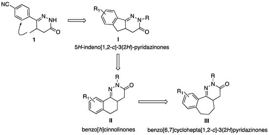 Our interest in tricyclic pyridazine-3(2H)one derivatives dates back several decades, when a series of benzocycloalkylpyridazinone-based tricyclic scaffolds of general formula I–III (Figure 2) were designed as rigid analogs of 5-methyl-6-para-cyanophenyl-4,5-dihydro-3(2H)-pyridazinone 1, endowed with antihypertensive activity together with inotropic, vasodilator, and antiaggregating properties. It was observed that such pharmacological effects are at least partly mediated by the inhibition of phosphodiesterase III (PDEIII) [].